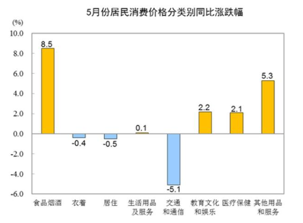 5月份,食品煙酒類價(jià)格同比上漲8.5%,影響CPI(居民消費(fèi)價(jià)格指數(shù))上漲約2.55個(gè)百分點(diǎn)。食品中,畜肉類價(jià)格上漲57.4%,影響CPI上漲約2.55個(gè)百分點(diǎn),其中豬肉價(jià)格上漲81.7%,影響CPI上漲約1.98個(gè)百分點(diǎn);水產(chǎn)品價(jià)格上漲3.7%,影響CPI上漲約0.07個(gè)百分點(diǎn);糧食價(jià)格上漲1.5%,影響CPI上漲約0.03個(gè)百分點(diǎn);鮮果價(jià)格下降19.3%,影響CPI下降約0.43個(gè)百分點(diǎn);蛋類價(jià)格下降12.3%,影響CPI下降約0.08個(gè)百分點(diǎn);鮮菜價(jià)格下降8.5%,影響CPI下降約0.22個(gè)百分點(diǎn)。