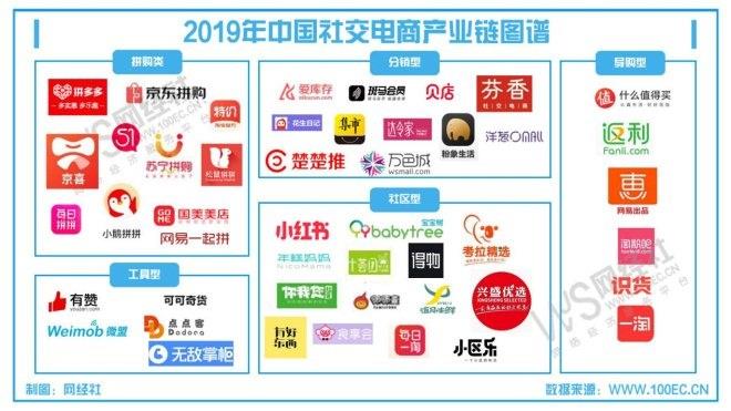 據網經社監測顯示,目前社交電商市場主要的玩家包括:1)拼購型:拼多多、京東拼購、京喜、蘇寧拼購、淘寶特價版、小鵝拼拼、國美美店等;2)分銷型:愛庫存、斑馬會員、貝店、芬香、花生日記、未來集市、達令家、粉象生活、楚楚推、萬色城、洋蔥OMALL等;3)社區型:小紅書商城、寶寶樹、考拉精選、年糕媽媽、有好東西、你我您、食享會、十薈團等;4)導購型:返利網、什么值得買、一淘網、淘粉吧、識貨網、惠惠等;5)工具型:有贊、微盟、點點客、可可奇貨、無敵掌柜等。
