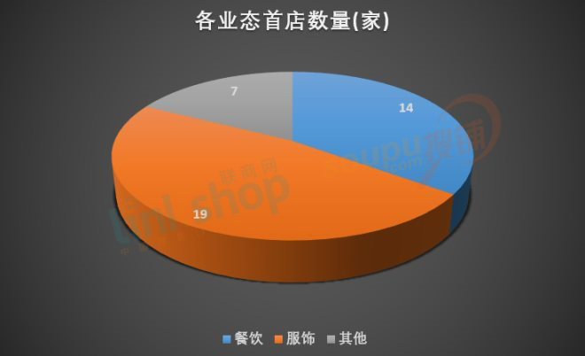 從首店業(yè)態(tài)來看,服飾鞋履19家,餐飲業(yè)態(tài)14家,兒童業(yè)態(tài)2家,美妝2家,生活服務(wù)1家,配飾1家,箱包 1家。由此可見,服飾和餐飲首店占比超八成,是品牌首店最多的業(yè)態(tài),也是最容易創(chuàng)新并出成績的熱門業(yè)態(tài)。