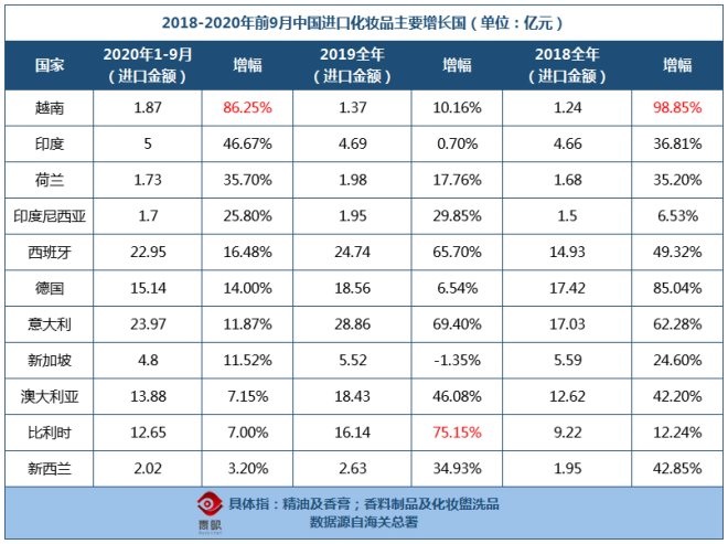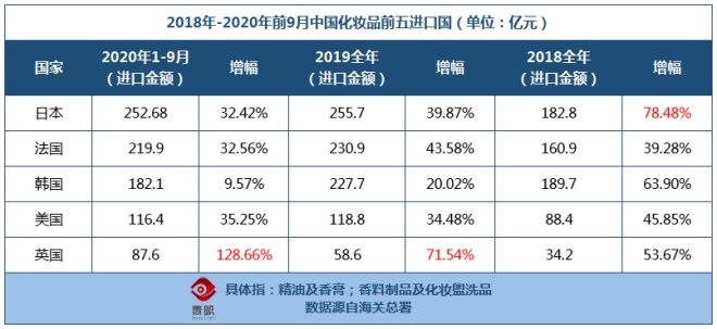 而從進口國來看,日本、法國、韓國仍為前三,小眾國家化妝品也仍有不小的潛力。