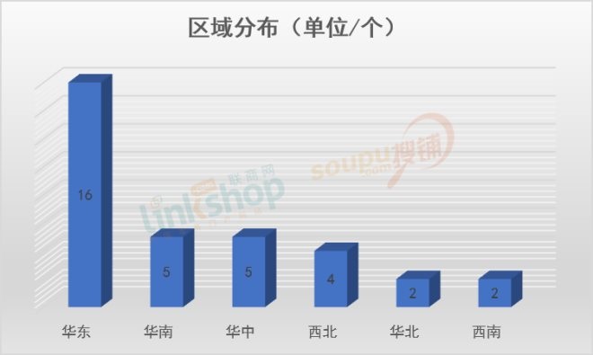 區域上看,華東繼續穩固自己的榜首地位,16個開業量領先其他六大區,開業量接近一半;華中和華南地區以5個開業量并列次席;西北以4個開業量緊隨其后,華北和西南各有2個項目開業,而東北則無項目入市。