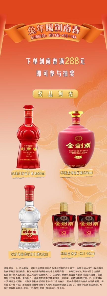 另外,即日起到215日,在永輝生活-詠悅匯酒庫平臺買劍南春滿288元即可參與抽獎,獎品有52度劍南春珍藏級500ml1瓶)、52度金劍南窖藏2500ml1瓶)、52度劍南春52度白酒500ml1瓶)、46度金劍南(K3100ml2瓶)。