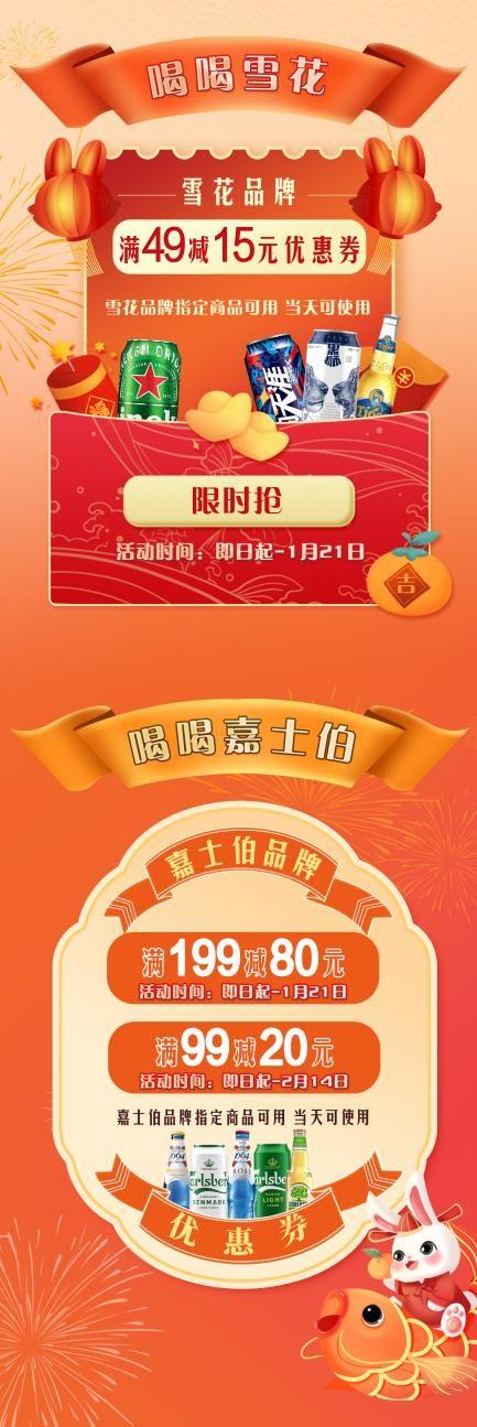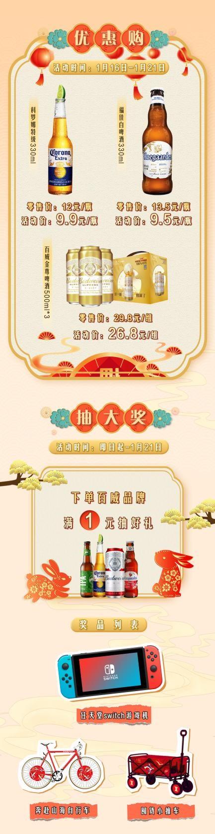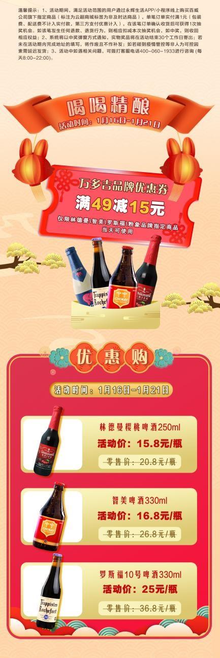 喜歡喝精釀啤酒的也不要錯過詠悅匯酒庫“好運在兔,酒在一起”活動。從116日到121日,在永輝生活-詠悅匯酒庫平臺上能領取到萬多吉品牌滿4915元優(yōu)惠券(當天可使用),可購買林德曼、智美、羅斯福、粉象品牌指定商品。