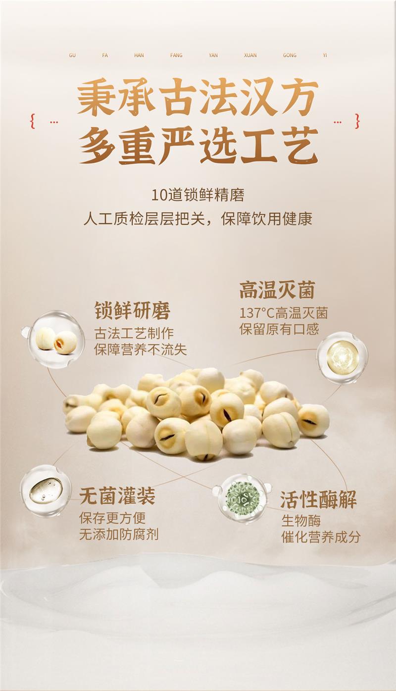 為了保證蓮子汁的純正本味和營養(yǎng)價(jià)值,該產(chǎn)品將藕粉、瓜子仁、核桃、冰糖等優(yōu)選新鮮原料嚴(yán)格按照科學(xué)配比融合,通過古法調(diào)制,真正實(shí)現(xiàn)了0香精、0色素、0防腐劑、0脂肪、0增稠劑的五“0”主義,通過在產(chǎn)品上做“減法”,為消費(fèi)者提供健康本味,成為低糖低卡人群的優(yōu)選飲品。
